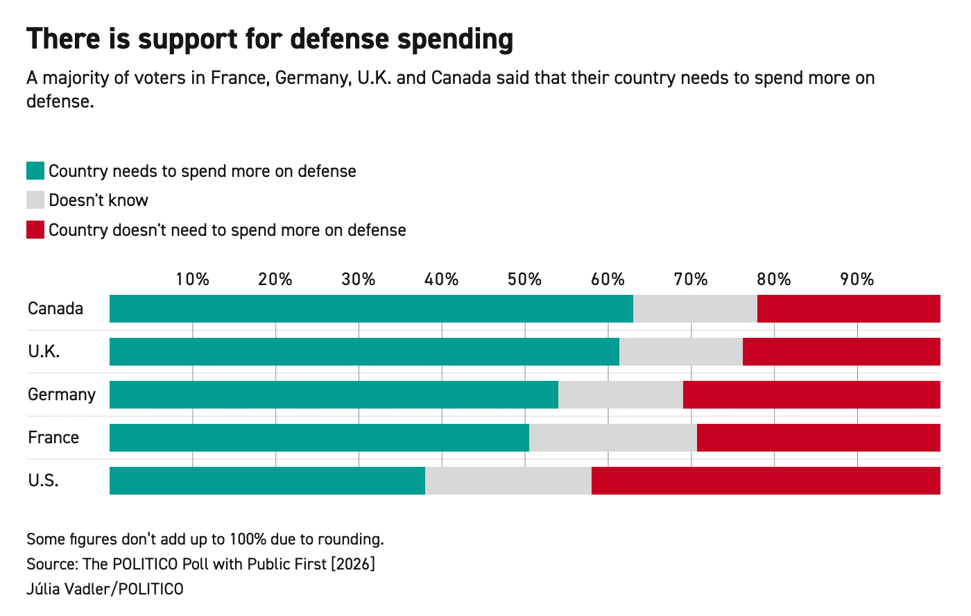 European voters say they support higher defense spending. But when asked whether they would accept higher taxes or cuts to welfare to fund it, approval falls from 40% to 28% in France and from 37% to 24% in Germany. That gap is Europe’s real defense problem.