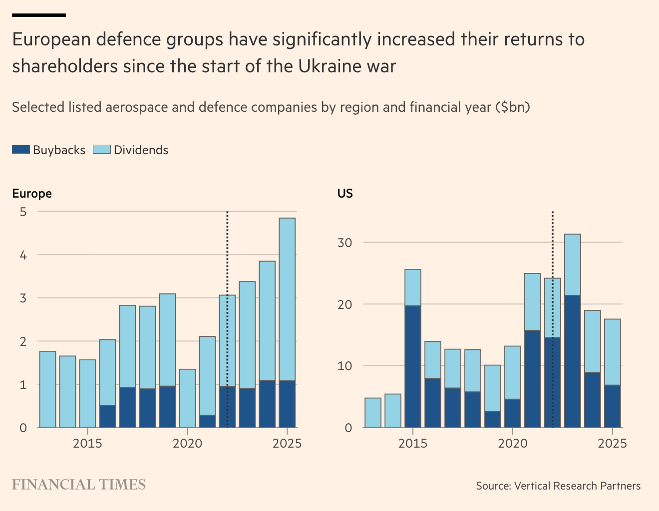 Capital allocation reinforces these dynamics. For two decades, Europe’s major defense contractors optimised for stable margins, predictable returns and low political risk. They returned capital, avoided aggressive acquisitions and treated excess capacity as waste. And now, even as governments speak openly about urgency, European primes continued to prioritise dividends and buybacks to the tune of $5B in 2025, a problem we wrote about on Air Street Press two years ago. At a time when we need to boost R&D and turbocharge the innovation economy to fight a rapidly evolving war, this is behavior we cannot collectively afford to incentivize.