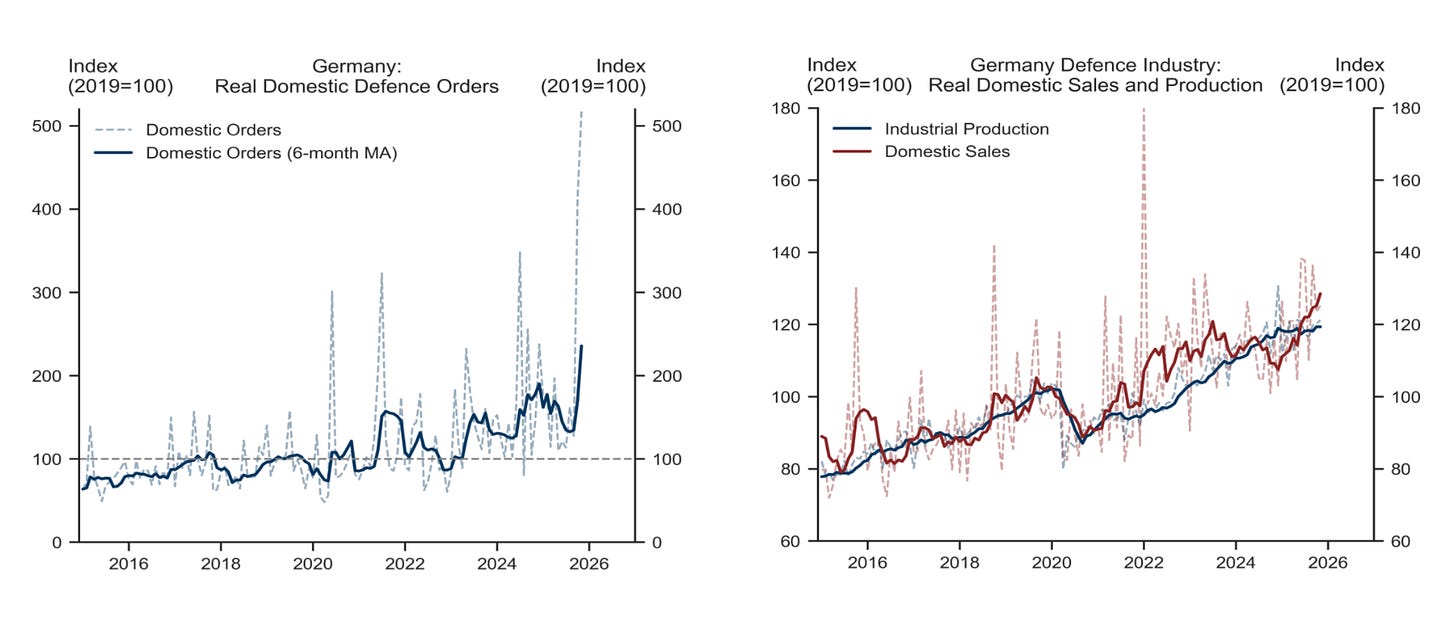 The political argument over whether Europe should spend largely collapsed, even if delivery remained uneven across countries. The harder question became what that spending could actually buy, and how quickly it could be turned into usable military capability. Germany illustrates the constraint. Between 2025 and early 2026, the six-month moving average of domestic defense orders rose by roughly 2x, while domestic sales increased by about 25%. Industrial production, by contrast, edged up only marginally over the same period, highlighting how quickly demand is now outpacing output.