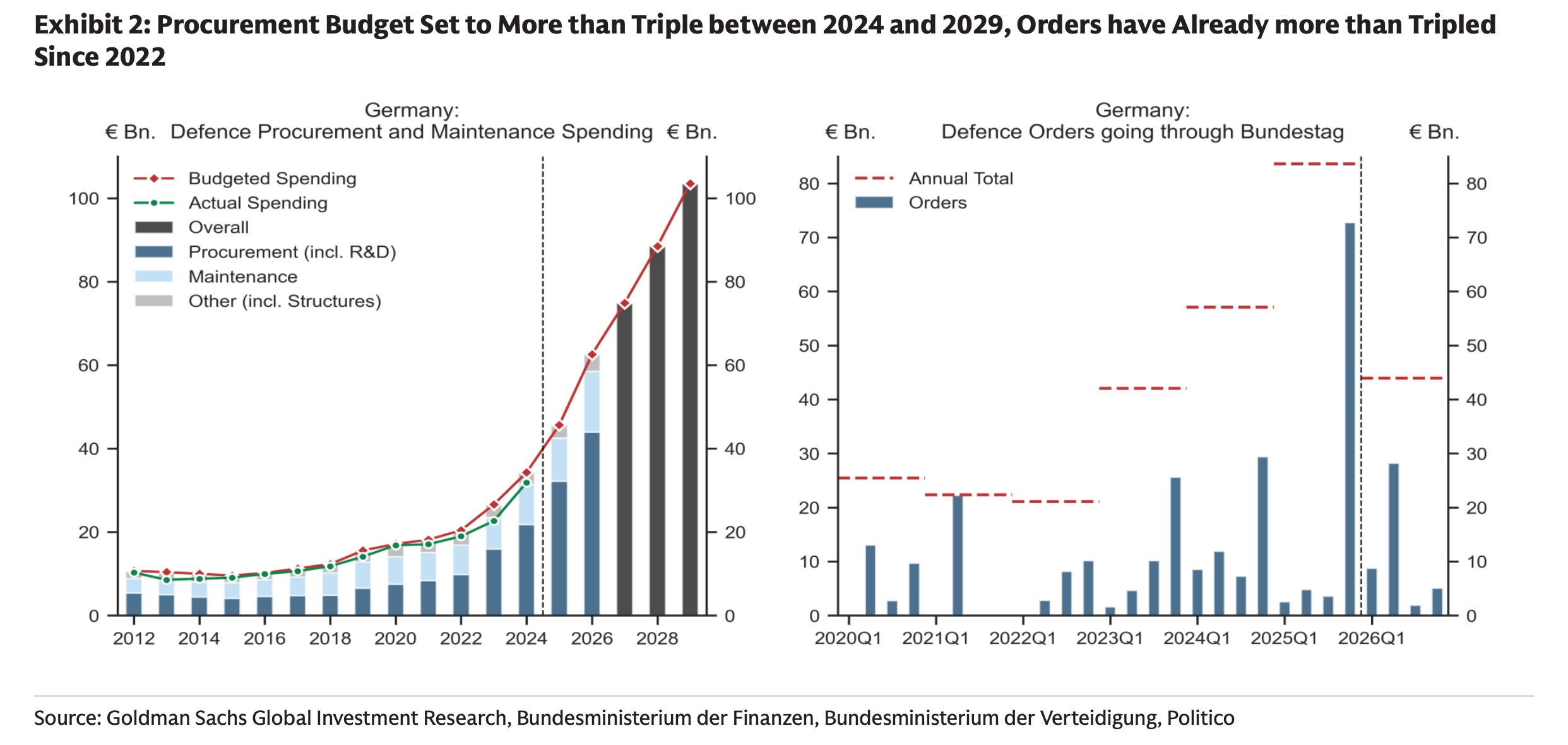 Germany, again, exhibits a different dynamic. In 2025 it accelerated approvals and contracting by passing the Bundeswehrbeschaffungsbeschleunigungsgesetz (literal translation Federal Armed Forces Procurement Acceleration Act) - a procurement‑acceleration law whose ambition to simplify process was clearer in intent than in nomenclature. Defense spending rose to nearly €80-90B, with a disproportionate share flowing into equipment. Contractors such as Rheinmetall report advance payments, fast‑tracked parliamentary approvals and flexible contracting to support rapid capacity expansion, particularly in ammunition and air defense. Budgeted procurement and maintenance spending is now set to rise from roughly €32B in 2024 to around €100B by 2029, while large orders requiring parliamentary approval more than quadrupled from about €20B in 2020 to roughly €80B by 2025.