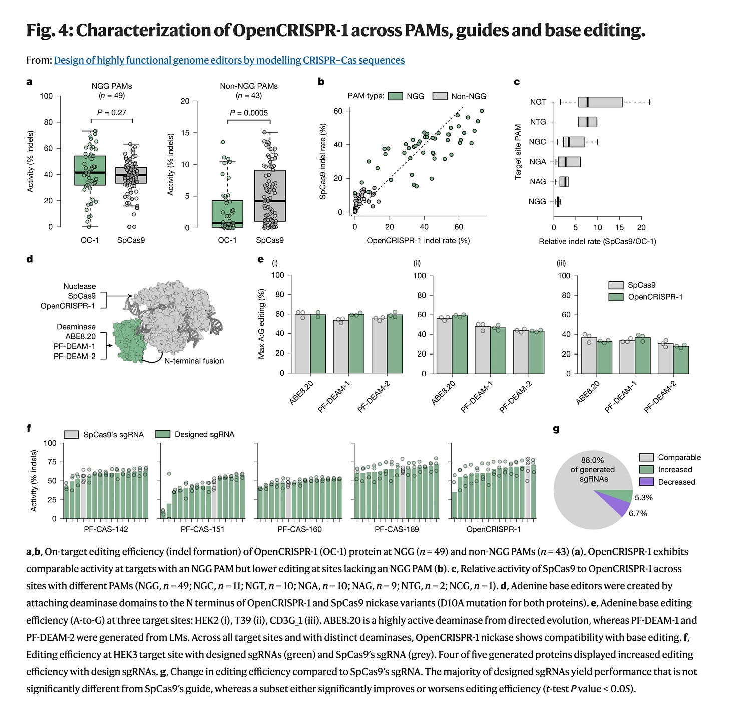 Further, it’s compatible with base editing and performs robust A-to-G conversions when fused to either evolved or AI-generated adenine deaminases. This hints at a future where entire gene editors, from protein to guide to payload, are AI-designed, component by component.