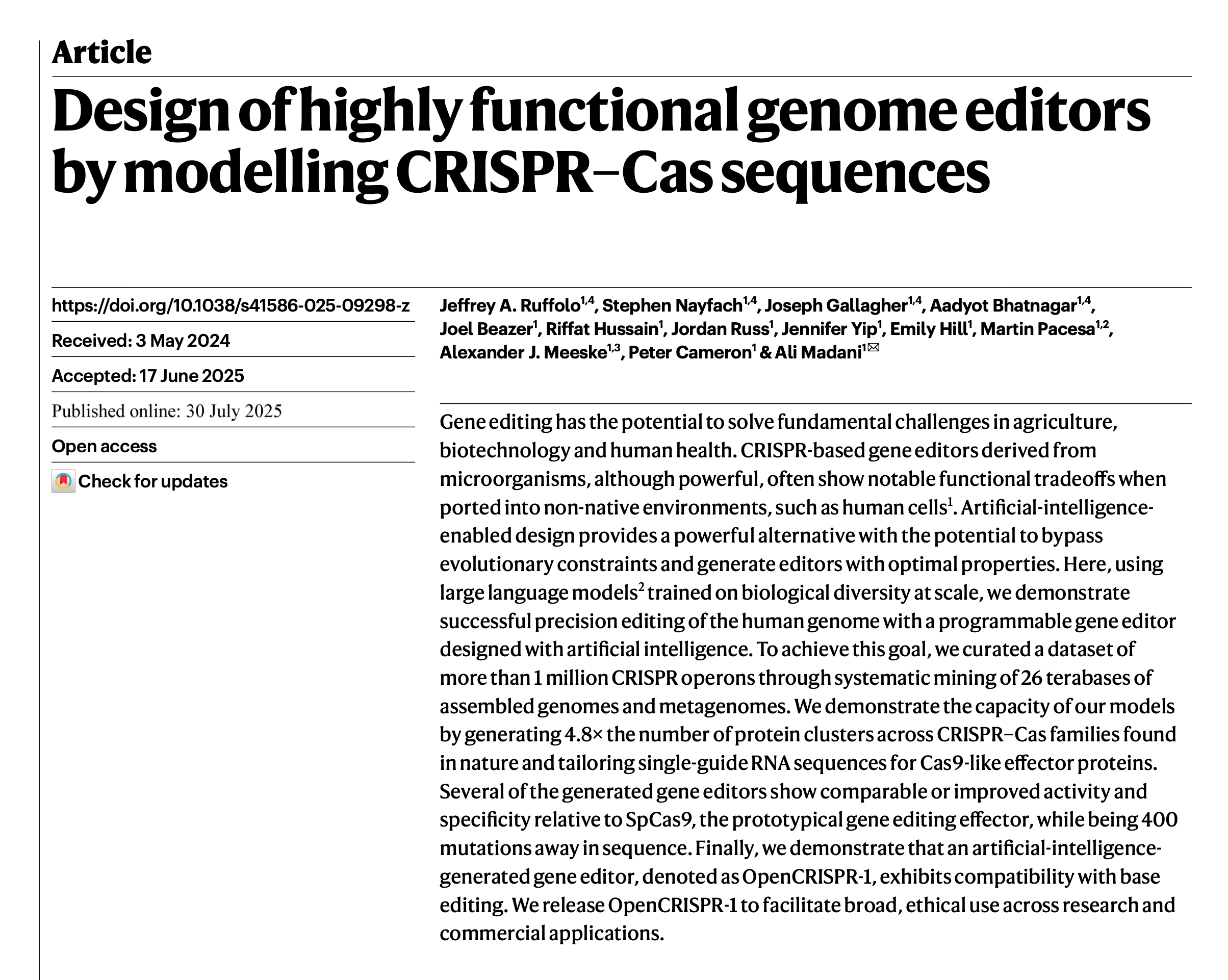 Today marks a significant scientific milestone for frontier AI systems in biology. Our portfolio company Profluent has its work on OpenCRISPR-1, the first AI-designed CRISPR-Cas protein that can precisely edit human DNA, published in the highest impact scientific journal, Nature.