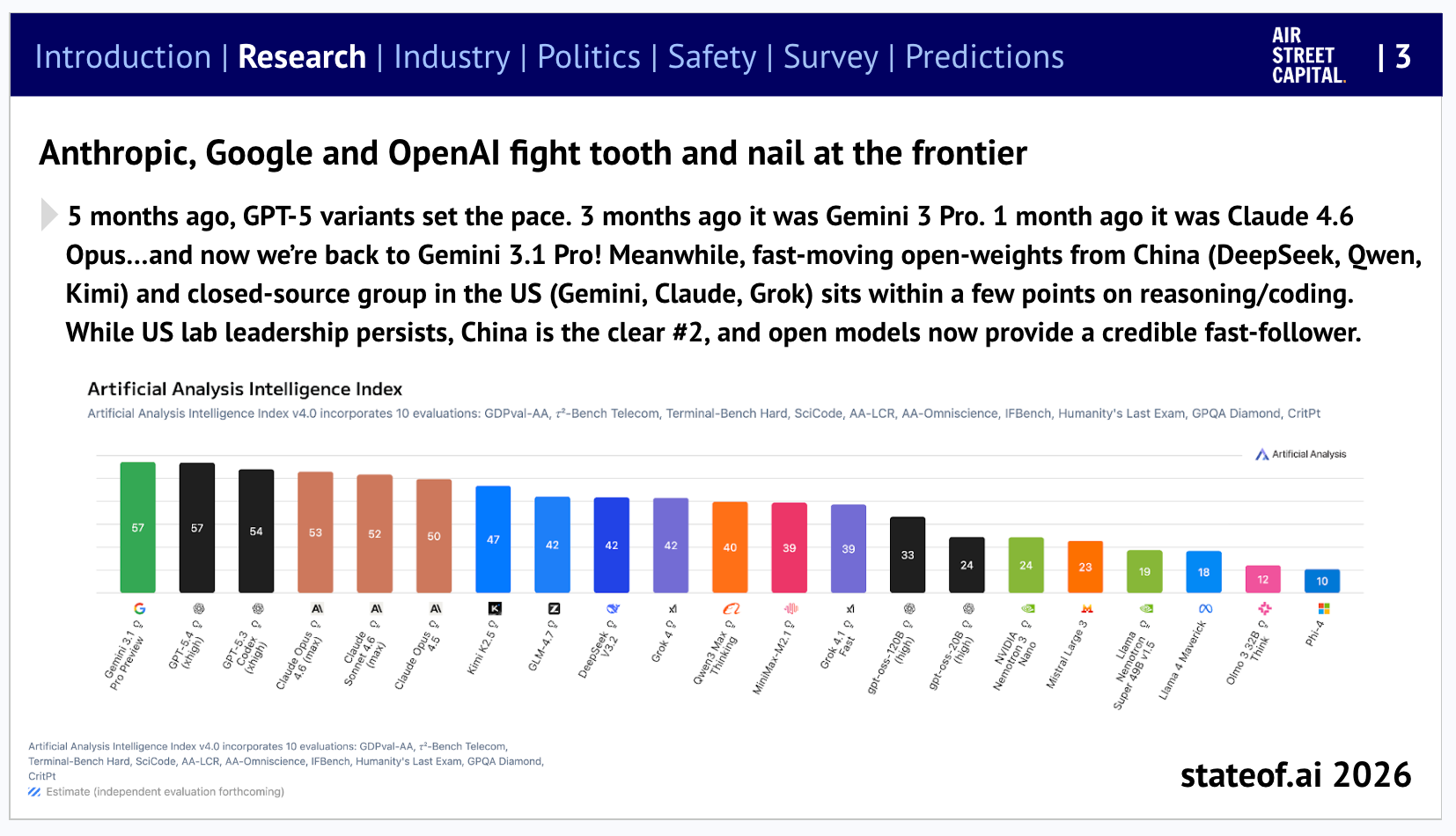 On the US side, the buildout continues, but is increasingly contested. Micron broke ground on a $100 billion megafab in Clay, New York, the largest semiconductor fabrication investment in US history, backed by $6.4B in CHIPS Act funding and $5.5B in New York state incentives, targeting 50,000 jobs over two decades. Meta signed a $27B AI infrastructure deal with Nebius, $12B in dedicated capacity on NVIDIA’s next-generation Vera Rubin platform plus $15B in additional compute, as part of an AI capex plan that Meta said would hit $115-135B in 2026 alone. And private equity entered the classified infrastructure market: Carlyle and KKR were separately awarded $2B contracts to build hyperscale data centers for the US Army. But the political wind is shifting: at least 11 states have introduced bills to restrict or ban data center construction, with Maine on track to be the first to pause development outright, while Sanders and Ocasio-Cortez introduced a federal moratorium bill that would halt all new builds until Congress passes AI worker and environmental protections. We predicted in the State of AI Report 2025 that data centre NIMBYism would hit US elections…it’s arriving faster than expected.
