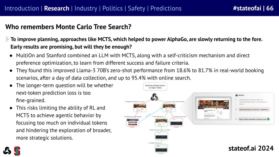 This ties into a wider trend we’ve seen, where combining LLMs with other approaches (like MCTS) can drive significant improvement on tasks that involve planning - a core component of reasoning. We covered this in the State of AI Report this year: