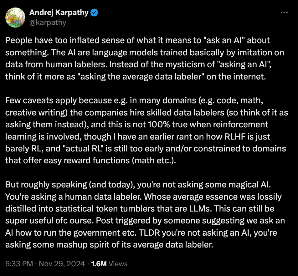 Not really. For a start, Andrej isn’t going full stochastic parrot. He doesn’t suggest models are mechanically reproducing training data patterns - asking the data labellers acknowledges meaningful synthesis and recombination. And by stating the importance of domain expertise, he doesn’t treat all training data as equally random or meaningless.